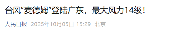 中国天气网提醒,今年9月以来,台风“塔巴”“米娜”“桦加沙”先后登陆华南,此次“麦德姆”带来的强降雨落区与前期降雨区域重叠度高,局地强风或具有极端性,正值国庆中秋假期,公众需密切关注临近预警信息,非必要不外出,持续警惕地质灾害、山洪、中小河流洪水、城乡积涝等各类次生灾害,注意自身安全。