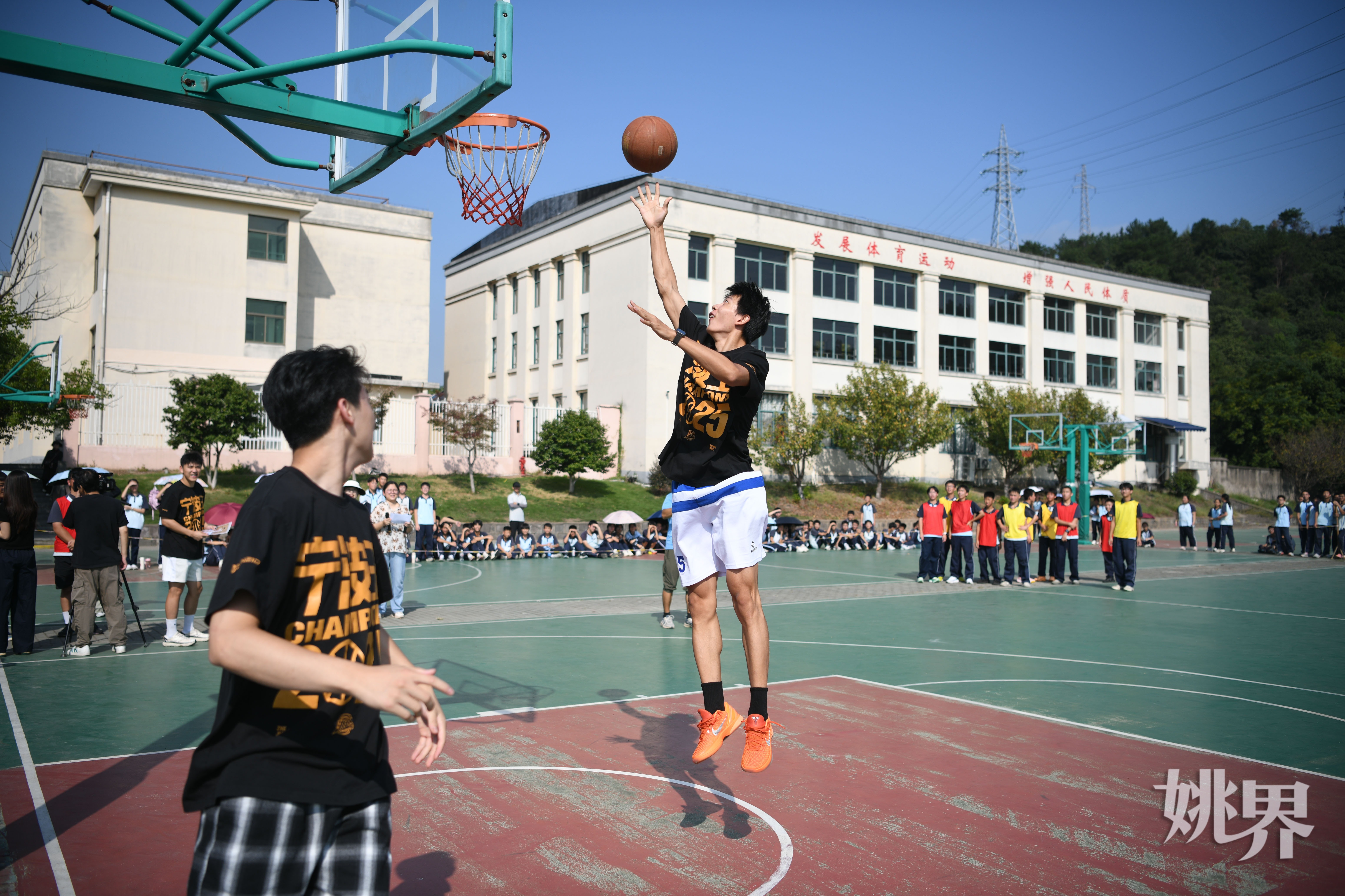 10月13日,“浙BA”余姚队的虞航、徐启超、陈嘉乐三位球员走进丈亭镇初级中学,与该校学生进行了一场别开生面的篮球友谊赛。